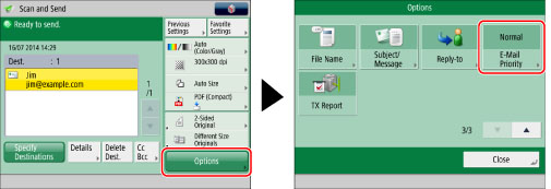 Specify the destination → press [Options] → [E-Mail Priority].