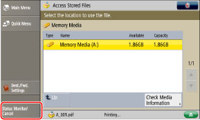 You can cancel printing a stored file from the touch panel display or from the Status Monitor/Cancel screen.