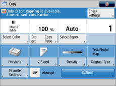 If you set <Allow Black & White Copy/Print Jobs> to 'On', [Black Copy/Print] appears on the screen for entering the Department ID and PIN and the screen for inserting a control card.