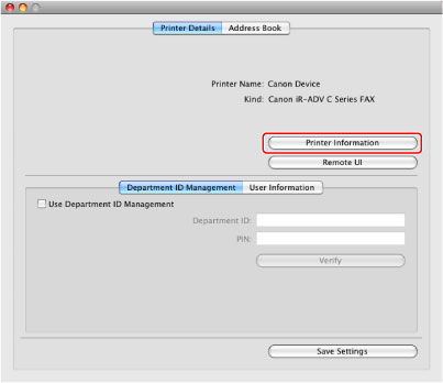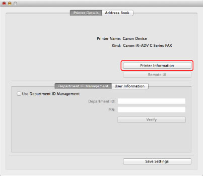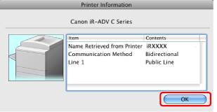 If the fax driver name displayed at the top of the [Printer Information] dialog box and the fax name displayed as [Name Retrieved from Printer] do not correspond correctly, you may not be able to use the fax functions correctly. If the names do not correspond, delete the fax you have added in [System Preferences] and adding it again. For details, see the "Canon Fax Driver Guide" (see " Installation").