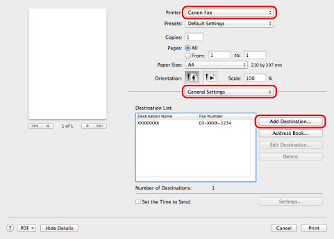 Select your fax → [General Settings] → click [Add Destination].