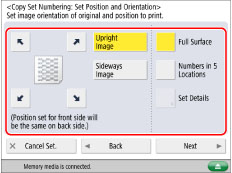 If you set <Number Option> to 'On' in [Copy Set Numbering Option Settings], [Full Surface] and [Numbers in 5 Locations] are grayed out and cannot be selected. (See "Copy Set Numbering Options.")