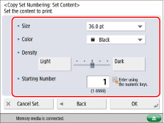 If you set <Number Option> to 'On' in [Copy Set Numbering Option Settings], you can set the copy set number size to [10.5 pt], [12.0 pt], or [14.0 pt]. (See "Copy Set Numbering Options.")