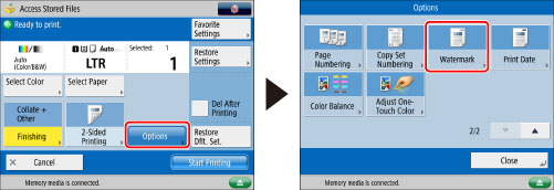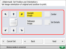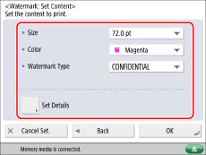 You can also select text that has been registered in [Register Characters for Page No./Watermark]. (See "Registering/Editing/Deleting User-Defined Text for Page Numbers and Watermarks.")