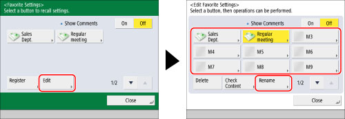 Press [Edit] → select the button to edit the name or comment for → press [Rename].