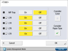 If you set to 'On', settings specified in "Specifying Paper Drawer Auto Selection Based on Colour" are applied. If you use different paper for colour copying and black copying, the specified paper sources are only eligible for use with Automatic Paper Selection and Auto Drawer Switching.