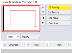 When designating an area, specify an area that is 15 mm or larger on one side. If you specify an area that is less than 15 mm on one side, a message prompting you to change the area size is displayed.