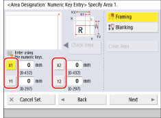 If you designate an area using the edit pen, the output image may not reflect the designated area precisely. To designate an area precisely, enter the values using the numeric keys.