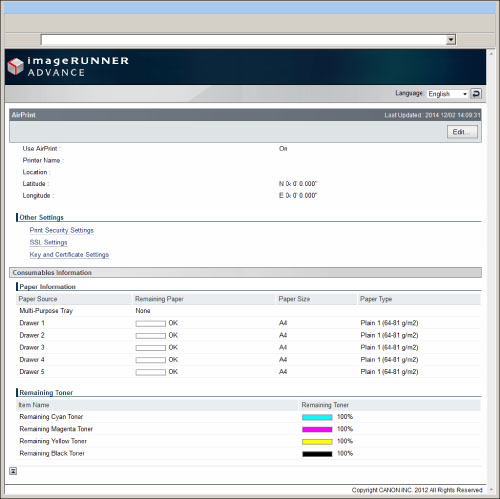 Enables you to check the values entered in the AirPrint settings, such as the name and location of the machine. You can click [Edit...] to change the settings.