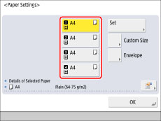 If [Custom] is displayed as the paper size when you load standard sized paper, press [Custom Size] → [Cancel Set.]. The proper paper size will be detected automatically and displayed on the screen.