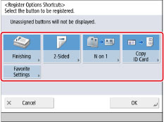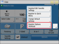 You can create shortcuts to frequently used functions in [Options]. You can also create shortcuts to [Favorite Settings]. For information on favorite settings, see "Storing, Recalling, and Deleting Favorite Settings (Favorite Settings)." These shortcuts then appear on the Basic Features screens.
