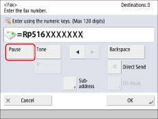 Press [Pause] after entering the outside line access number ('R' in the above example) and before entering the fax number.