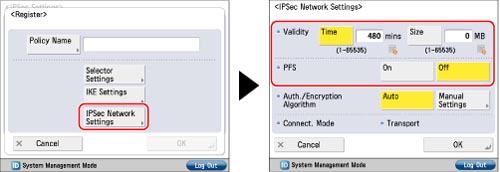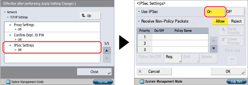 Press [IPSec Settings] for [TCP/IP Settings] → [On] for <Use IPSec>.
