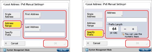 To specify a range of IPv6 addresses: Press [Address Range]. Press [First Address] → enter the first IPv6 address → press [OK]. Press [Last Address] → enter the last IPv6 address → press [OK].
