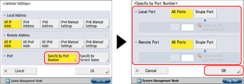 Press [Specify by Port Number] for <Port> → specify <Local Port> and <Remote Port> → press [OK].