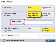 Press [Pre-Shared Key Method] for <Authentication Method> → [Shared Key].