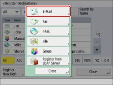 The first character that you enter for the name is used for sorting the destination list when you press keys, such as [ABC], [DEF], and [GHI], on the Address Book screen. If [Search by Name] is pressed on the Address Book screen, a screen for narrowing the search in the Address Book appears.
