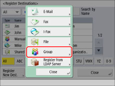 The first character that you enter for the name is used for sorting the destination list when you press keys, such as [ABC], [DEF], and [GHI], on the Address Book screen. If [Search by Name] is pressed on the Address Book screen, a screen for narrowing the search in the Address Book appears.