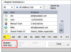 If you press [Register E-Mail as I-Fax], the key lights to show that this setting is turned on, and the selected e-mail address can be registered as an I-fax destination. To register e-mail addresses as I-fax addresses, register one e-mail address at a time.