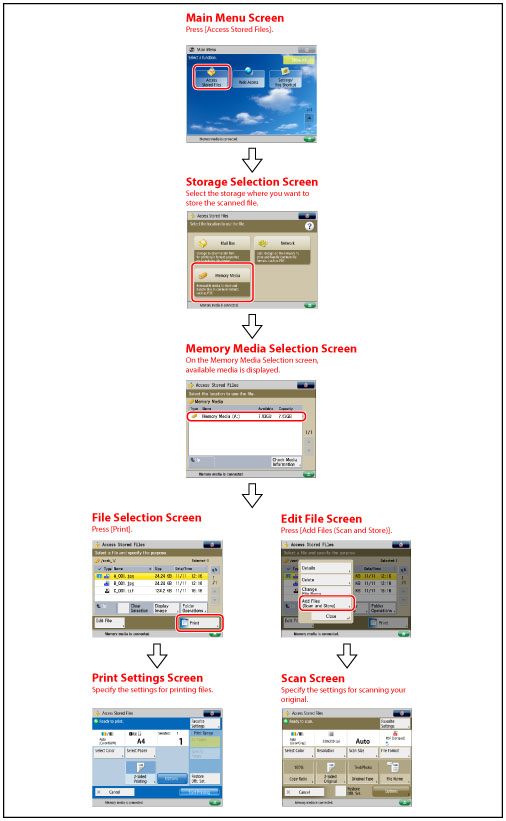 For the procedure regarding [Add Files (Scan and Store)] and instructions on operating the Scan screen, see "Adding a File (Scan and Store)" and "Flow of Scan and Store Operations."