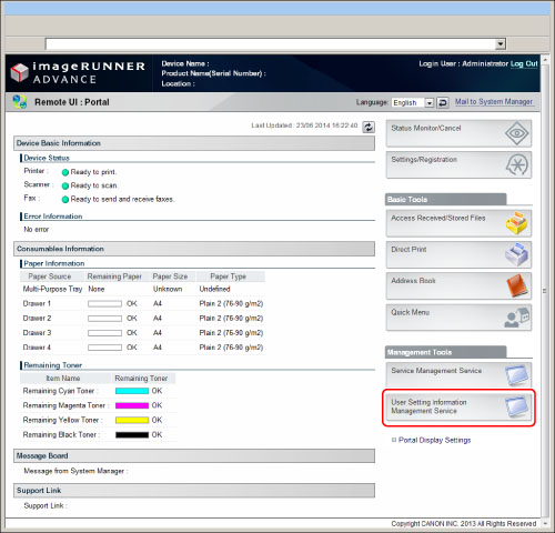 Only the System Manager or Administrator can perform operations on the User Setting Information Management Service page. For information on the type of administrator, see "Setting Administrators."