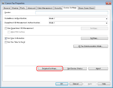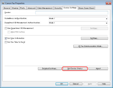 If you are using a shared printer, you need to install Canon Driver Information Assist Service in the print server computer in order to use the [Get Device Status] function. For details about how to install the Canon Driver Information Assist Service, see the "Fax Driver Installation Guide" (see "Installation").