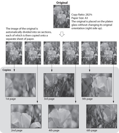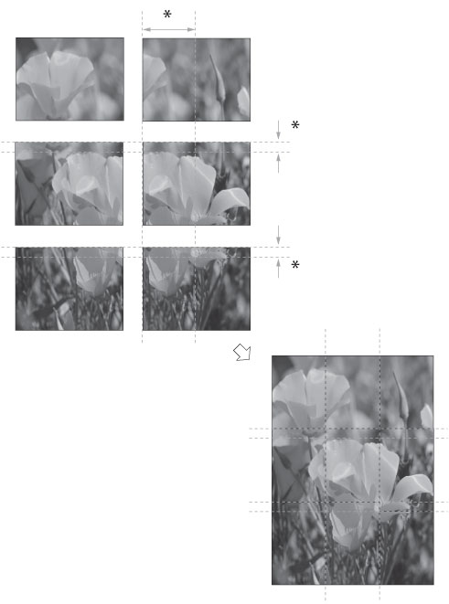 Copies of the original image made in the Poster mode overlap. Join neighboring sheets together by pasting over the overlapping areas.