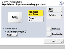 Si un écran s'affiche pour demander de régler les guides coulissants, régler leur écartement → spécifier le format papier → appuyer sur [OK].