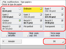 Il est possible de mémoriser des types de papier ne figurant pas sur la liste des réglages détaillés pour Sélection du type de papier. Pour plus d'informations sur la mémorisation d'un type de papier personnalisé, voir "Mémorisation/modification des types de papier personnalisés".