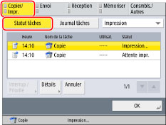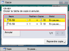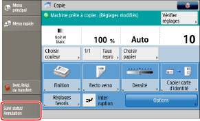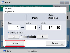Si l'on appuie sur [Annuler] dans l'écran qui apparaît pendant la copie ou en mode d'attente, il est possible d'annuler la tâche en cours de copie, ou la dernière tâche pour laquelle un original a été lu et qui est en attente de copie.
