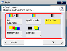 Le réglage par défaut est "Noir et blanc" pour toutes les fonctions de copie.