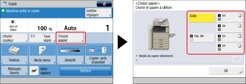 Si [Choix auto cassette selon couleur] est défini sous [Réglages de fonction] (Réglages/Enregistrement), la sélection automatique du papier est possible selon le mode couleur sélectionné pour la copie.(Voir "Définition du choix automatique de cassette selon la couleur".)