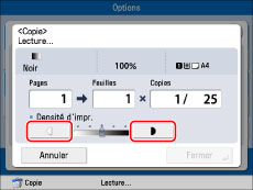 Si la densité est modifiée dans [Options], la modification de la densité pendant la copie risque de n'avoir aucun effet sur la sortie.