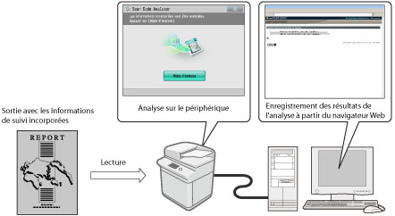 Il est possible d'analyser les informations de suivi intégrées présentes sur la feuille afin de découvrir l'auteur, la date, et la machine à l'origine du document. L'outil d'analyse des informations est nécessaire pour analyser les informations de suivi. Pour plus d'informations, voir "Document Scan Code Analyzer for MEAP."