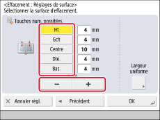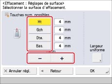 Sélectionner les côtés souhaités → appuyer sur [-] ou [+] pour définir leurs largeurs d'effacement respectives.