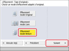 Appuyer sur [Effacement mode Reliure] → appuyer sur [Suivant].