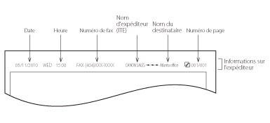 Si la machine est réglée pour que ces informations soient imprimées sur l'en-tête des documents envoyés, et si certains éléments n'ont pas été enregistrés, seuls les éléments enregistrés et le nombre total de pages s'impriment sur l'en-tête.