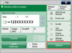 Si [Fax] est réglé sur "Oui" dans [Limiter nouveau destinataire], il est impossible d'entrer de nouveaux destinataires. Dans ce cas, sélectionner un destinataire mémorisé dans le carnet d'adresses local, dans le carnet d'adresses distant, sur un serveur LDAP ou sous un bouton de composition 1 touche. (Voir "Restriction de l'envoi à de nouvelles adresses".)