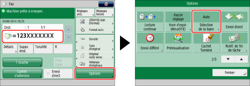 En cas de sélection de [Auto], le numéro de téléphone et le nom enregistrés pour la ligne utilisée pour l'envoi sont imprimés sur le papier du destinataire. Ils peuvent également apparaître sur l'afficheur tactile de la machine du destinataire.