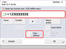 Saisir le numéro de fax → appuyer sur [Sous-adresse].