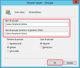 Dans la boîte de dialogue [Nouvel objet - Groupe], saisir le nom de groupe ("Canon Peripheral Admins") → cliquer sur [OK].