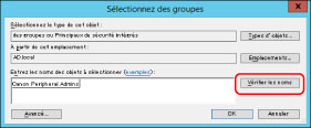 Saisir "Canon Peripheral Admins" dans la boîte de dialogue de sélection du groupe → cliquer sur [Vérifier les noms].