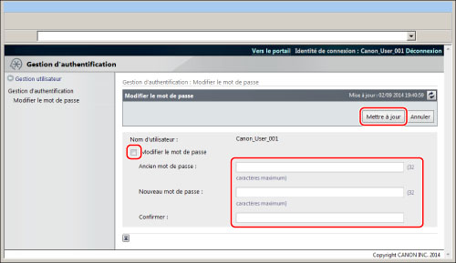 Sélectionner [Modifier le mot de passe] → saisir les mots de passe appropriés → cliquer sur [Mettre à jour].