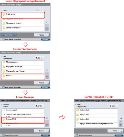 (Réglages/Enregistrement) sur le panneau de commande → se connecter en tant qu'utilisateur disposant des droits requis à l'aide de l'afficheur tactile. Pour plus d'informations, voir "Définition des administrateurs".Spécifier les réglages dans [Réseau] sous [Préférences] en fonction de l'environnement réseau. Les captures d'écran ci-dessous illustrent le déroulement des opérations pour spécifier les réglages réseau.
