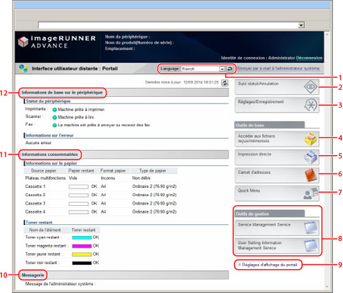 Lorsque l'on modifie la langue d'affichage à partir de la page de portail de l'interface utilisateur distante, il se peut qu'elle ne s'affiche pas correctement si elle diffère de celle utilisée sur l'afficheur tactile de la machine.