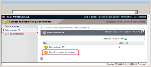 Cliquer sur [Accéder aux fichiers reçus/mémorisés] → [Boîte mémoire RX] → [Boîte RX données fragmentées].