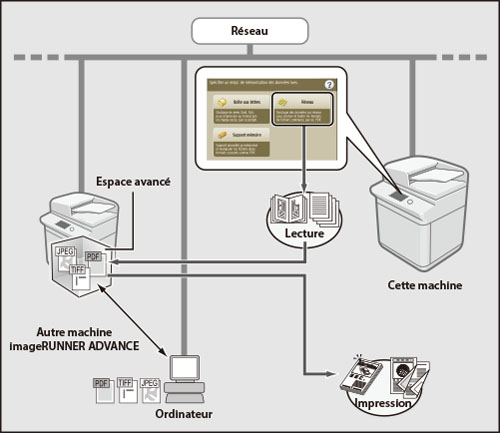 La sélection de l'espace avancé d'une autre machine de la série imageRUNNER ADVANCE depuis [Réseau] permet de lire un document et de le mémoriser dans l'espace avancé d'une autre machine de la série imageRUNNER ADVANCE. Il est également possible d'utiliser cette machine pour imprimer des fichiers mémorisés dans une autre machine de la série imageRUNNER présente sur le réseau.