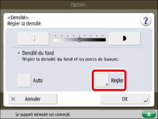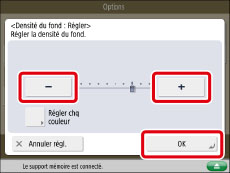 Si la densité de fond est réglée en appuyant sur [Régler] sous <Densité du fond>, le réglage [Auto] est annulé. De même, si l'on appuie sur [Auto] pendant le réglage manuel de la densité sous [Régler], les réglages sont annulés. La machine règle automatiquement la densité en fonction du fond.