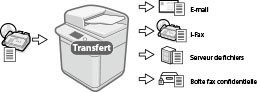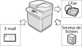 L'envoi aisé de documents lus à un ou plusieurs destinataires par e-mail ou I-Fax développe l'efficacité de l'échange de documents dans un environnement de travail. La possibilité d'envoyer des documents sur des serveurs de fichiers FTP, SMB et WebDAV permet également d'utiliser la numérisation (lecture) pour faciliter l'accès aux données et leur gestion.