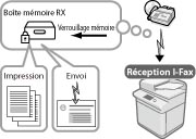 Il est possible de régler la machine pour qu'elle enregistre les documents reçus par I-Fax dans la boîte mémoire RX, au lieu de les imprimer. Les informations concernant l'émetteur et le nombre de pages de chaque document peuvent être consultées avant l'impression ou le transfert à un autre destinataire.